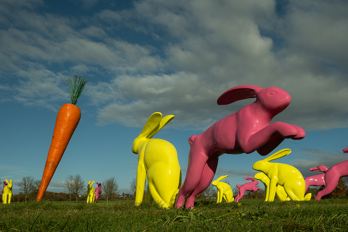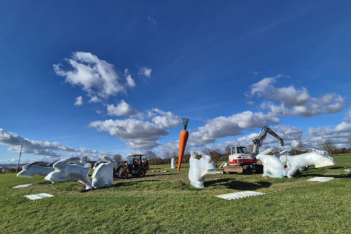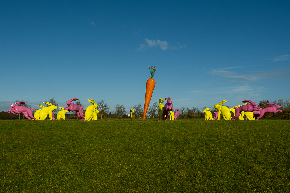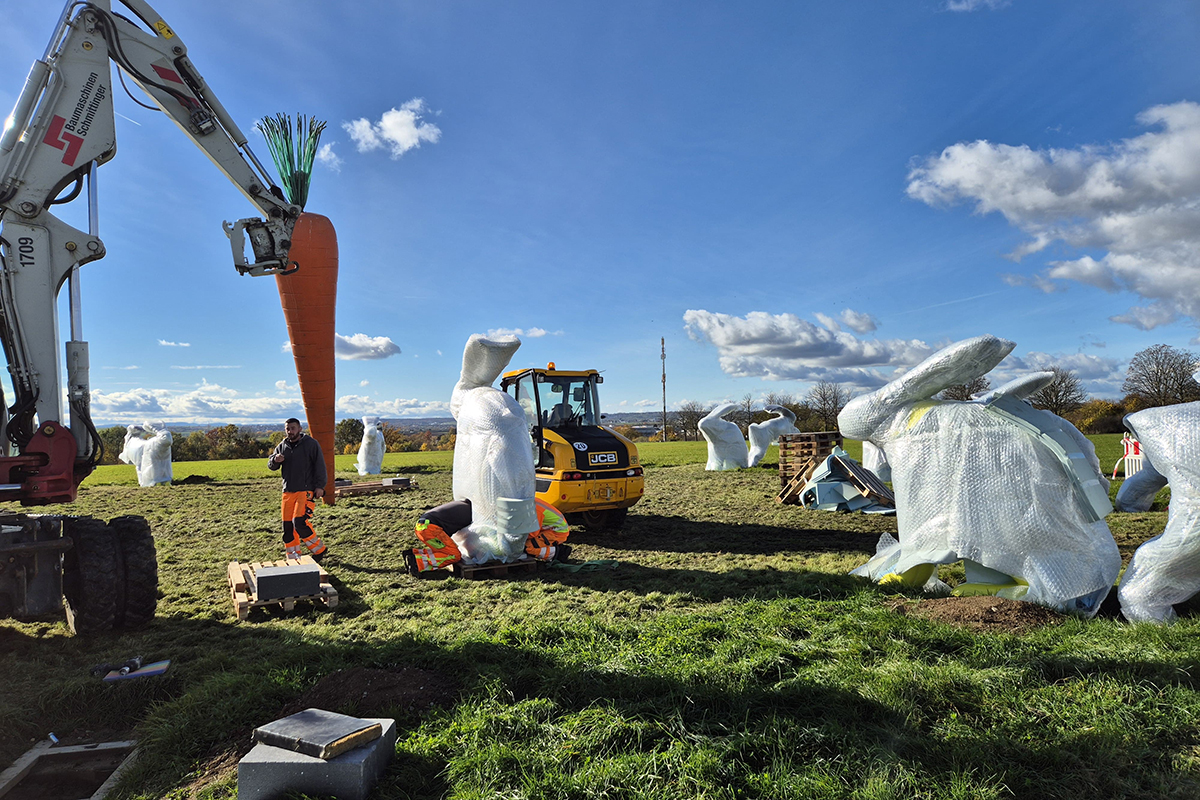 In der letzten Oktoberwoche 2025 wurden die Sitz- und Flitzhasen an ihrem alten Ort rund um die Möhre im Scharnhäuser Park wieder aufgebaut. Nach mehrwöchigen Restaurationsarbeiten sind sie frisch gestählt und erstrahlen wieder in den ursprünglichen Farben – poppigem Neongelb und Rosa – so wie es einst von der Künstlerin rosalie für die Landesgartenschau konzipiert war.
