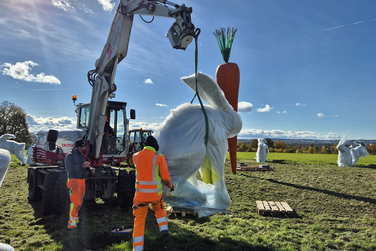 Schon frühmorgens rückten zwei große LKWs zum Abtransport an. An den Tagen zuvor hatte der Städtische Baubetriebshof bereits die Fundamente freigelegt und die Hasen am Wegrand abgestellt. Mit dem Gabelstapler wurden die Hasen in Gurten hängend auf die LKWs verladen. Bis zu ihrer Rückkehr steht nun nur noch die große Mohrrübe ganz einsam auf ihrer Wiese und erinnert an die fehlenden Hasen. Diese sind inzwischen heil vor Ort angekommen und warten auf ihr Facelifting. Vielen Dank den Mitarbeitern vom Städtische Baubetriebshof und allen Spenderinnen und Spendern sowie den Paten, die dazu beigetragen haben, dass die Hasen nun wieder hergestellt werden können. Wir freuen uns auf ihre Rückkehr!